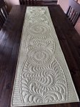This custom table runner measures 67" x 17". It has double batting to really accentuate the custom quilting. It is a sage green color. Please refer to the photos as the green is hard to tell from the photo on the table. This table runner can be washed and dried on cold. I would suggest not washing as the fabric will crinkle and take away from the custom quilting as it is cotton and will shrink when washed. I take my table runner off the table before any food is served to prevent it from needing to be washed. It's lasted great for many seasons. Perfect for your holiday table. $200